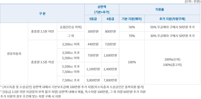 총중량 3.5톤 미만의 경유자동차의 경우 5등급 기준 300만원, 4등급 기준 최대 800만원 범위내에서 지원 받을수 있습니다. 총중량 3.5톤 이상의 경우 5등급 기준 440만원~3,000만원, 4등급의 경우 720만원~ 7,800만원 범위내에서 지원 받을수 있습니다.